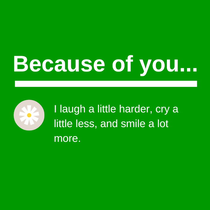 7) “Because of you, I laugh a little harder, cry a little less, and smile a lot more.”